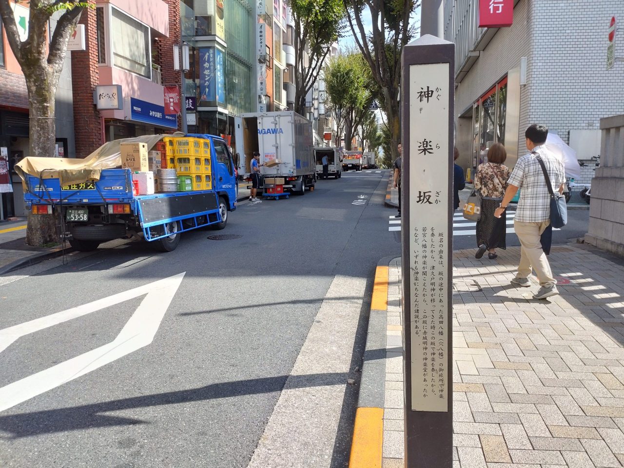 熱海湯階段を抜けると「東京神楽坂組合」の前に出るのでそのまま神楽坂通りに向かい
